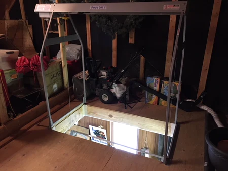 Versa Lift can be installed as a garage storage lift in virtually any home. The wonderful part about these motorized pulley lift kits is the installation is easy and comes with detailed instructions. Our Versa Lift Model 24 has a 15.3 cubic foot, 200 lb. lifting capacity. For most homeowners storing items in their attic or overhead garage space is more than enough resistance. The lifting platform is 20-3/4″ x 44″. Contact us today for a free consultation!